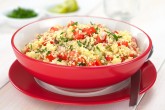 3. صبي المزيج فوق الطماطم والبقدونس والبصل والفلفل وحركي المزيج جيداً حتى تتجانس المكونات.