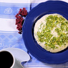 10. قبل التقديم ادهني وجه الكيك بالكريمة المخفوقة ورشي الفستق الحلبي وقدميها.