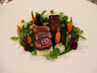 7. في طبق التقديم، توضع قطعة اللحمة مع صلصة الكرز والتوت البرّي، والى جانبه القرنبيط المطحون.