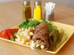 4. لتحضير الساندويش: ادهني خبز التورتيلا بالثومية، وضعي كمية من شاورما الدجاج مع أصابع من مخلل الخيار والبطاطس المقلية ولفي الساندويش على شكل الرول.