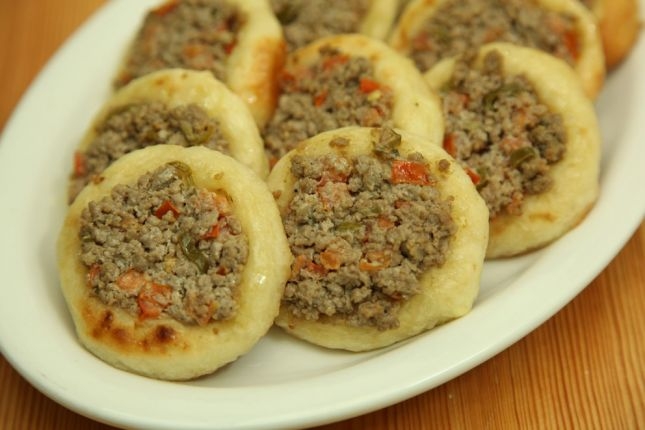 4. نقطع العجين الى كرات صغيرة ونتركها تختمر 15 قيقة ثم نمدها في صواني الفرن المدهونة بالزيت ونمد عليها ملعقة كبيرة من اللحم الذي حضرناه. ثم نشويهم في الفرن على حرارة عالية.