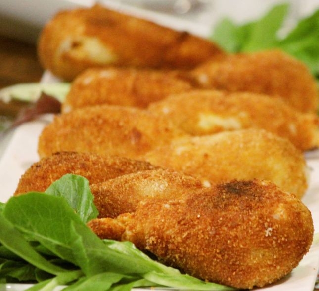 4. نغطس القطع المحشوة بالطحين ثم البيض ثم القرشلة ونقليها بزيت حامي وغزير لتتحمر وتأخذ اللون الذهبي وتقدم ساخنة.