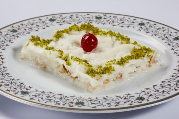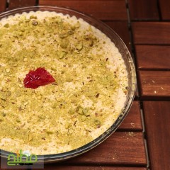 4- يزيّن الطبق بالفستق المبشور ، اللون المحمّص وأوراق من زهر الليمون.