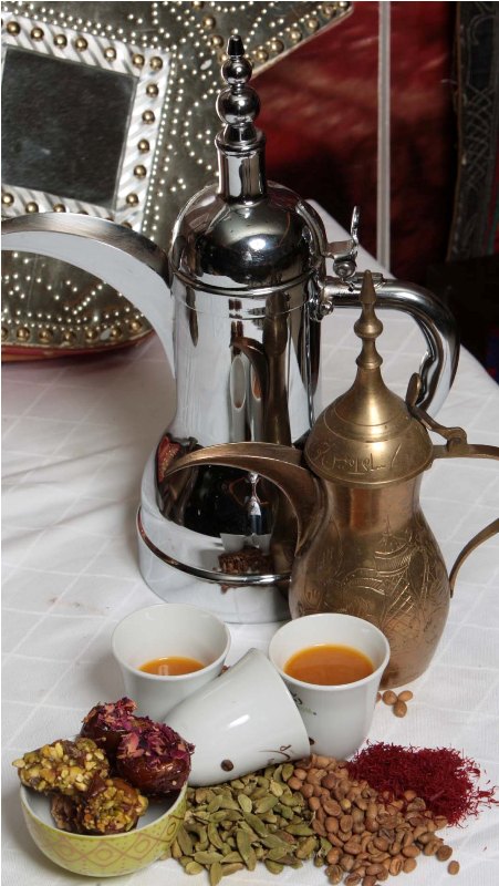 2. يوضع الهيل والزعفران وماء الورد في الدلة، ثم تسكب القهوة فوقها.
