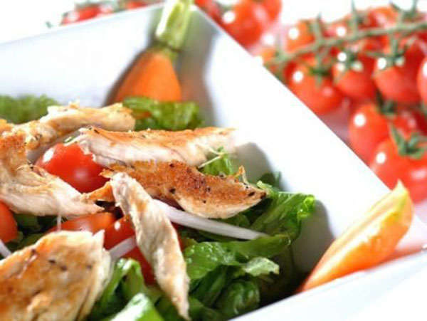 4. يقطّع الدجاج بالطول ثم يوضع على خليط السلطة.