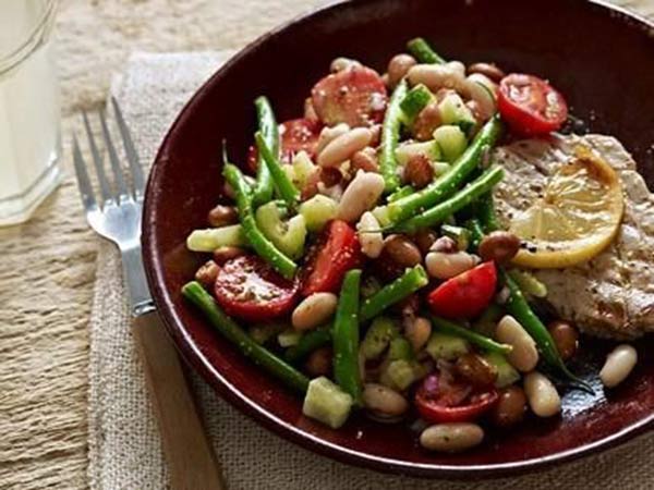 1. يضاف كل من اللوبياء الخضراء وحبات الفاصولياء والفول إلى قدر تحتوي على الماء المغلي المضاف إليه الملح. ثم، تغلى القدر ثانية على نار هادئة لمدة 5 دقائق، إلى أن تصبح الحبوب طريّة بعض الشيء. تصفّى، وتغسل بالماء البارد.