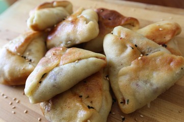 - ضعي الفطائر في صينية فرن مبطنة بورق الزبدة.