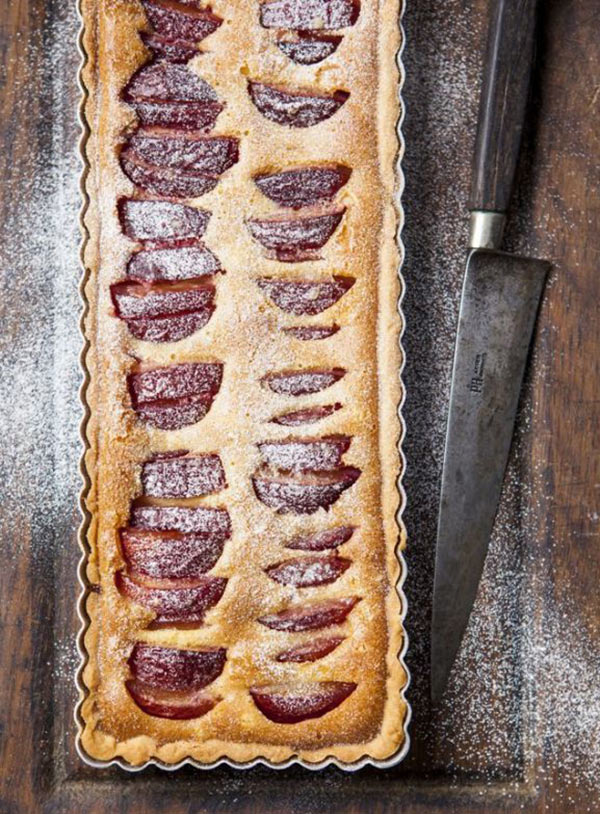 4. يُخلط كلّ من الكريما ودقيق الذرة والبيض والسكر ومستخلص الفانيليا، لإعداد طبقة "الكاسترد"، ويصب قدر الامكان منها في الصينية فوق العجينة، ثم يضاف البرقوق على الوجه، وتُعاد إلى الفرن وتخبز من 25 إلى 30 دقيقة، حتى يستقرّ الحشو. ثم تُخرج الصينيّة وتوضع على الشبك لتبرد، وذلك لمدة 10 دقائق، وتقدّم.