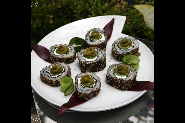 7-  تلفّ أوراق الطحالب ببطء، حتى تشكّل لفائف متماسكة. ثمّ تقطّع كلّ واحدة منها إلى 6 قطع، تغمس بمزيج الصعتر والسمّاق المحمّص والسمسم وحبّ البركة.