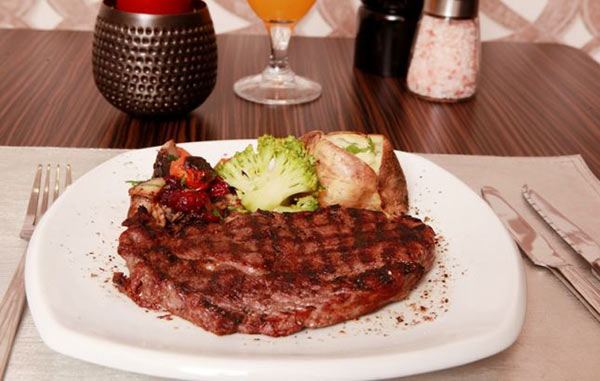 4. للتقديم: في طبق التقديم، ضعي شريحتي لحم البقر المشويتين، وإلى جانبهما البطاطس المشوية، والخضر المقلية. قدّمي هذا الطبق ساخناً، ومزيناً بالبقدونس المفروم.