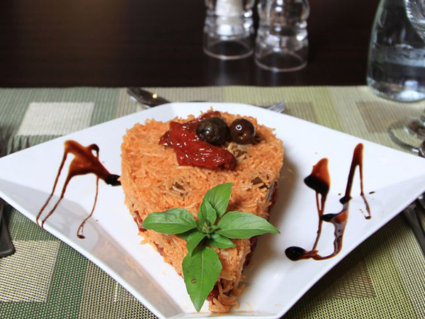 2. يُسخّن، في قدر توضع على النار، الزيت. ثم، يُضاف الأرّز إليه، مع التقليب لدقيقتين، ليُسكب الماء بعدها ويُنثر الملح ويُضاف معجون البندورة، ويوضع الفلفل المفروم والزيتون في القدر. تُغلق هذه القدر، وتبقى على النار حتى يجفّ الماء. يقدّم هذا الطبق ساخناً.