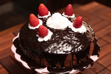 11. أخرجي الكيك من القالب وضعيه على طبق التقديم، ثم اسكبي الصلصة فوق الكيك.