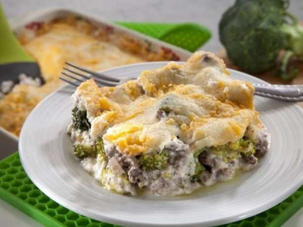 6. أسكبي ربع كمية الصلصة في طبق الفرن، وزّعي البروكولي، اللحم والجبن «شيدر». أسكبي بقية صلصة البشاميل. وانثري جبن «موزاريللا».