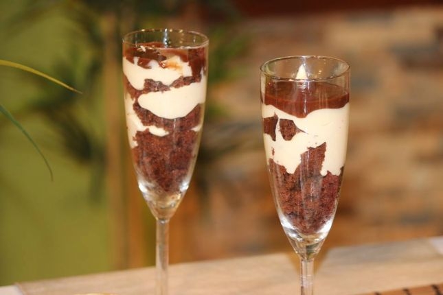 1. نضع بالكاسات كيك الشوكولاتة المفتت.