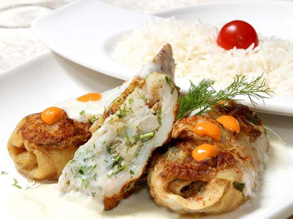 4. تُصفّ لفائف الدجاج في صينيّة الفرن غير اللاصقة، ويُسكب حولها كوب ونصف الكوب من مرق الروبيان، مع نثر الدقيق على سطحها، ثم تُغلّف هذه الصينيّة بالقصدير، وتُدخل الفرن حتى تنضج.