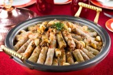- وزعي كمية من صلصة الطماطم في طبق الفرن وضعي رولات الملفوف المحشو عليها ثم وزعي باقي كمية الصوص فوق الملفوف.