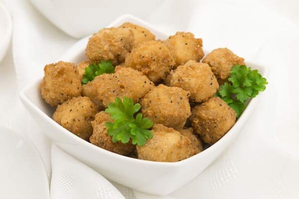 7. ثم تُغمس مرة ثانية فى خليط فتات الخُبز، وتُقلب به جيداً حتى تُغلف بطبقة كثيفة ويتضاعف حجم مكعبات الدجاج.
