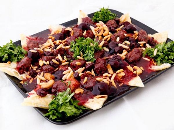 3. طريقة التقديم: يقطّع رغيف الخبز إلى مثلثات ترتّب في طبق التقديم، ثم يسكب فوقها الكباب مع عصير الكرز. ويزيّن بالبقدونس المفروم والصنوبر المحمص ورشة من قرفة الناعمة وبعض حبات الكرز.