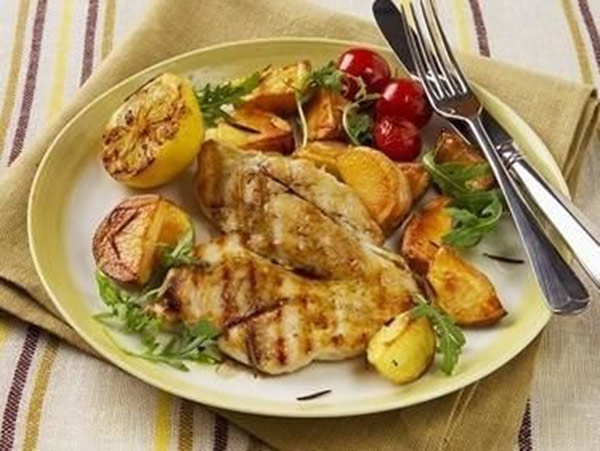 2. يدهن صدرا الدجاج بالزيت، وينثر الملح والفلفل عليهما، ويقليان في مقلاة لمدّة 3 دقائق من كل جهة، حتى يصبحا بنيّي اللون، مع إضافة البندورة والليمون الحامض إلى المقلاة. ثم، يسكب خل البلسميك. ويزيّن هذا الطبق بأوراق الجرجير.