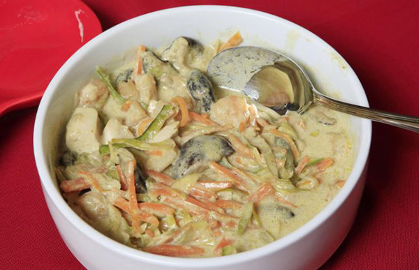 4. يُضاف حليب جوز الهند وصلصة الصويا والكزبرة والزنجبيل والدجاج والروبيان مع الملح والفلفل الأسود، ونتركها على نار خفيفة لمدة 10 دقائق، ويُقدّم.