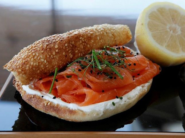 2. يوضع فوقها اللبنة والشمّر والقبّار، ومن ثم ترتّب قطع سمك السلمون المدخّن بشكل متناسق.