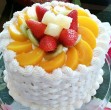 - قطّعي قالب الكيكة بحسب رغبتك وزيّني وجهه بالكريمة ومزيج الفواكة.