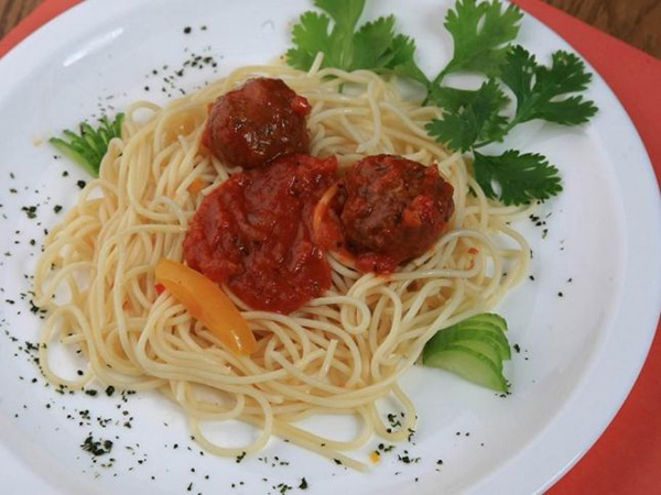 3. تُضاف صلصة البندورة إليها وكرات اللحم، ويُزيّن الوجه بجبن البارميزان.