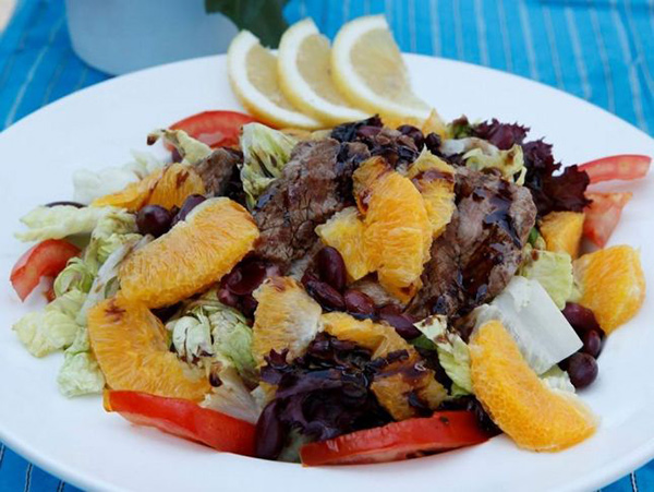 5. للتقديم: تضاف الصلصة إلى الخس، ثم يوضع اللحم عليها، فشرحات البرتقال.