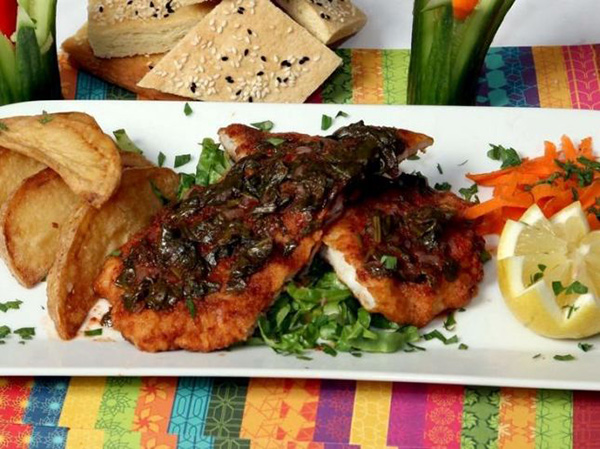 7. طريقة التقديم: يعد طبق التقديم، يزيّن بالخس والليمون الحامض وتوزّع قطع السمك والبطاطا، ويضاف السبانخ على كل قطعة من السمك.