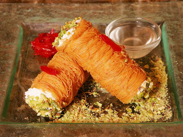 2. تترك الصينيّة حتّى تبرد، ثمّ تُحشى اللفائف على جانبيها بالقشطة، ثمّ بالفستق.