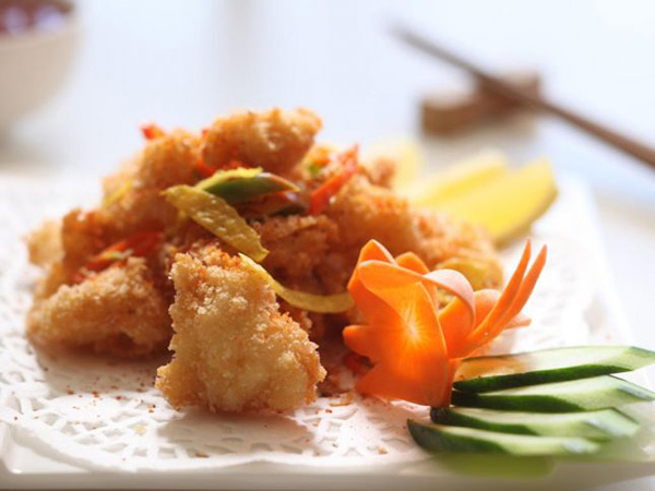 3. يسخّن الزيت على حرارة تبلغ 140 درجة مئويّة. يُقلى الحبّار فيه، ثمّ يرفع من الزيت. يقطع إلى أوصال متساوية، ويوضع في طبق التقديم، ويُزيّن بالليمون المبشور والفلفل الأخضر المقطّع والسمسم، ويُنثر مسحوق الفلفل الأحمر عليه. ويقدّم مع صلصة الفلفل الحلوة (بابريكا).