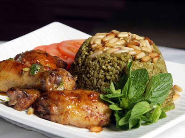 3. تسكب الفريكة في طبق التقديم، ويوضع فوقها الدجاج أو اللحم، وتزيّن بالصنوبر واللوز.