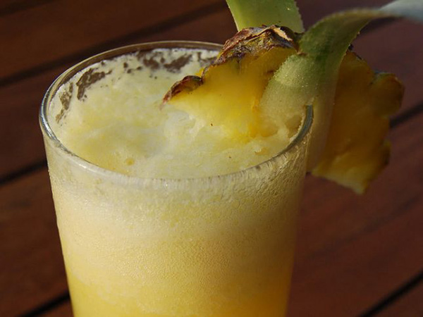 3. يُصبّ العصير في كأس، ويُضاف الثلج المجروش إليه، ويُزيّن بالأناناس.