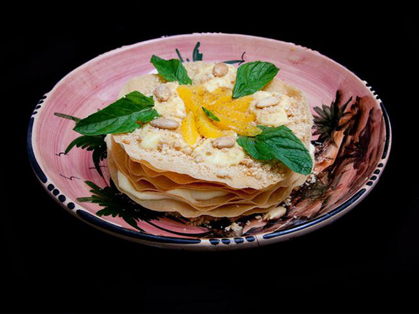 3. وفي طبق التقديم، توضع ورقة مزدوجة تُدهن بالكريما، ثمّ تغطّى بورقة أخرى، وذلك حتّى الحصول على طبقات خمس. يزيّن الوجه باللوز المطحون والسكّر والقرفة، ويُمكن إضافة النعناع والفاكهة.