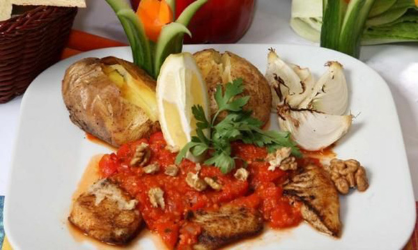 3. نخرج السمك من الفرن بعد التأكد من نضج السمك ثم نقوم بشي بصلة وحبتين من البطاطس ثم نضع السمك في طبق التقديم ونضع عليه الصلصة مع حبات من الجوز ويزين الطبق بحبة البصل المشوية مع البطاطس وعرق من البقدونس.