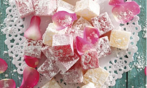 5. ينخل كلّ من بودرة السكر والكميّة المتبقيّة من دقيق الذرة سوياً. توضع الحلوى على سطح خشبي، وتقطّع إلى مربعات. وتغمّس بخليط بودرة السكر ودقيق الذرة.