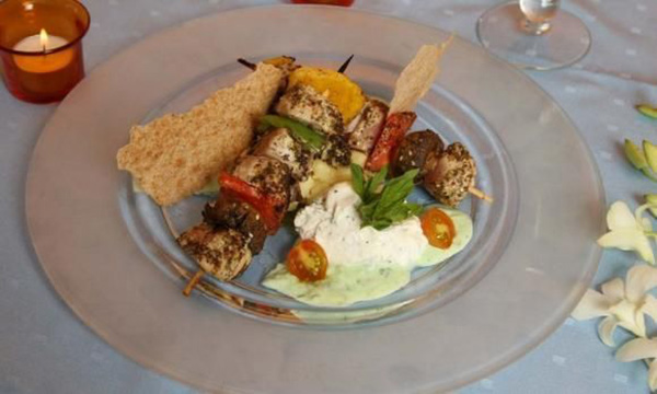 3. يتمّ توزيع قطع الدجاج والخضر المقطّعة على عيدان السيخ، ويتمّ شيّها على الشواية.