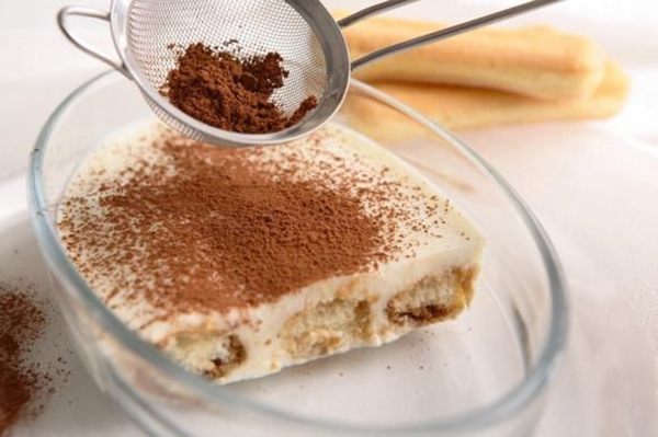 9. يوضع الكاكاو بمنخل صغير ويُنثر على وجه التيراميسو بالتساوي. تُقدم باردة. تُقطع الصينيّة الى 15 قطعة متساويّة.