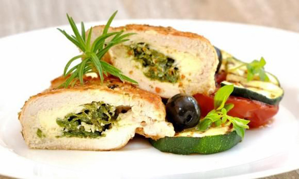 8. تُترك صدور الدجاج المحشوة لتبرد قليلاً، ثم تُقطع إلى شرائح وتُقدّم مع سلطة التبولة.