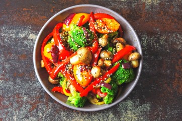 - ضعي في وعاء كبير، البروكلي وشرائح السلمون والفليفلة والطماطم وأوراق الجرجير.