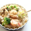 - أضيفي الثوم وقلّبي لمدة دقيقة، بعدها أضيفي السلمون والكاليماري والجمبري والكابوريا وبلح البحر، وحرّكي المكونات لمدة ثلاث إلى أربع دقائق، ثم أضيفي الدقيق وقلّبي جيداً.