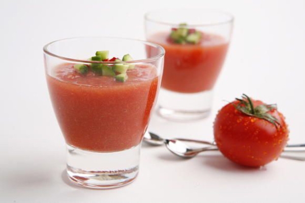 3. يزاد فوق الطماطم: الخبز المنقوع، الثوم، عصير الطماطم بالعلب، التوابل، زيت الزيتون. يخلط المزيج تدريجياً بالخلاط حتى ينعم.