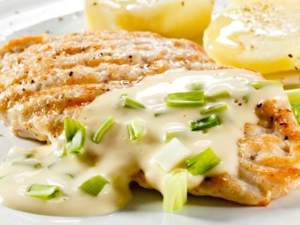 4. يقلى البصل في وعاء يحتوي على الزبدة، حتى يذبل. ثم، يضاف البهار الأبيض والكريما. ويدع هذا المزيج على النار لمدّة خمس دقائق. ثم، يسكب فوق الدجاج.