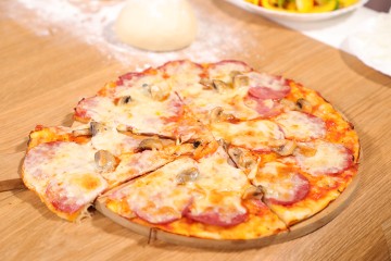 - وزعي جبن الموزاريلا على العجينة، ثم أضيفي شرائح السلامي، ورشي البهارات الإيطالية.