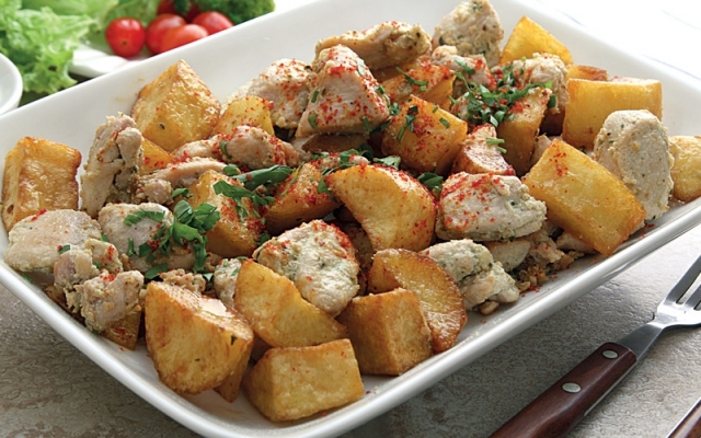 3. تقلى البطاطا بزيت غزير وتخلط قطع البطاطا المقلية مع مكعبات الطاووق المشوية.