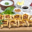 - وزعي حشوة اللحم على العجين المقطع، وبللي أطراف العجين بالماء حتى يسهل إغلاقها، ثم شكلي العجين على شكل مربع مفتوح الوجه.