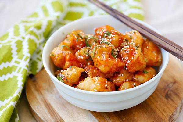 5. عند التقديم نسكب الدجاج مع الصوص في طبق التقديم ونرش السمسم عليه، يقدم إلى جانب الأرز الأبيض أو النودلز.
