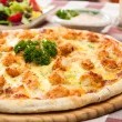 - يُسكب خليط الدجاج فوق عجينة البيتزا، وفوقها السلامي، والبصل والجبن.