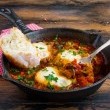 - يضاف البيض برفق في مقلاة فوق الطماطم، ثم تنقل المقلاة إلى فرن مسخن مسبقاً وتخبز حتى ينضج البيض، لحوالي 10 دقائق.