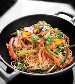 - أضيفي النودلز إلى الخضار مع المتبقي من صوص الصويا، قلبي المزيج برفق ثم قدَّمي الطبق ساخناً مع قطع الدجاج.